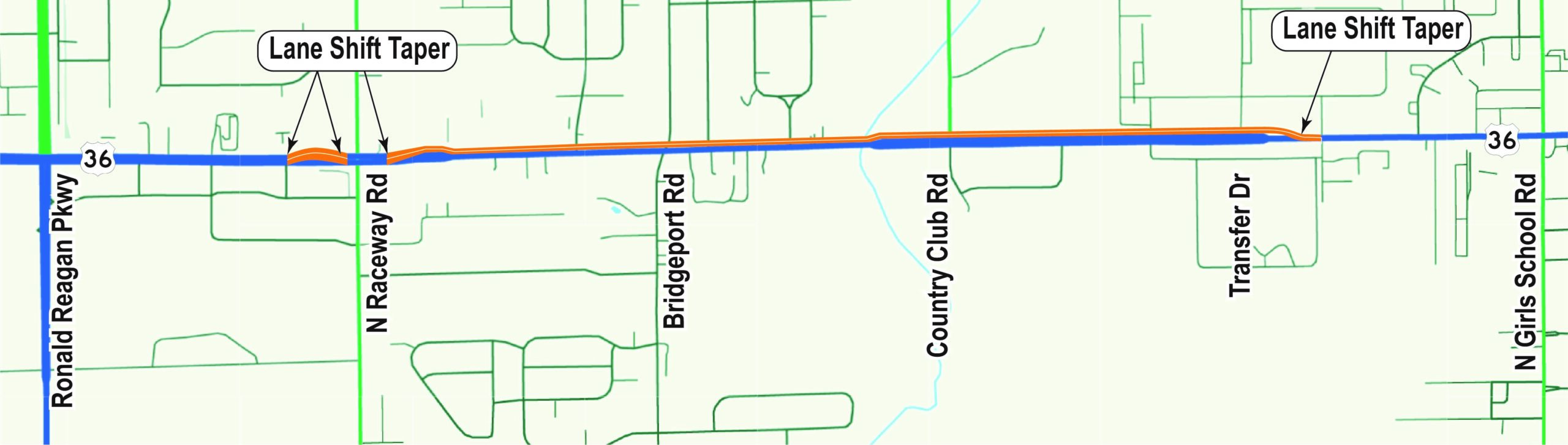 March 11, 2026: Traffic will be shifted to the westbound lanes in order to perform construction on the south side of U.S. 36. Be aware that lane shift tapers will be occurring near Raceway Road and east of Transfer Drive.